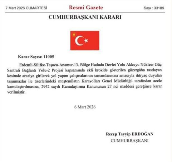 Resmî Gazetede yayımlanan karara göre, Erdemli-Silifke-Taşucu-Anamur Otoyolu Projesi kapsamında Akkuyu Nükleer Güç Santrali bağlantı yolu için acele kamulaştırma yapılmasına karar verildi. Karar, Recep Tayyip Erdoğan’ın imzasıyla yürürlüğe girdi.