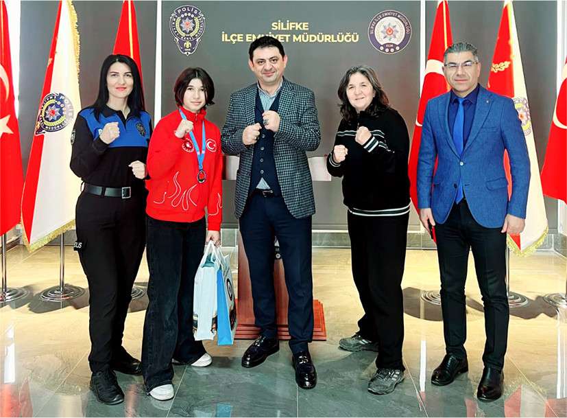 Muaytai Dünya Şampiyonu unvanını elinde bulunduran, 2025 Wushu Kungfu Türkiye Şampiyonası’nda büyük bir başarıya imza atarak şampiyon olan Silifkeli milli sporcu Büşra Naz Çelik, antrenörü Teslime Çelik ve Gazi Ortaokulu Müdürü Cuma Avşar ile birlikte İlçe Emniyet Müdürü İsmail Petek’i ziyaret etti.
