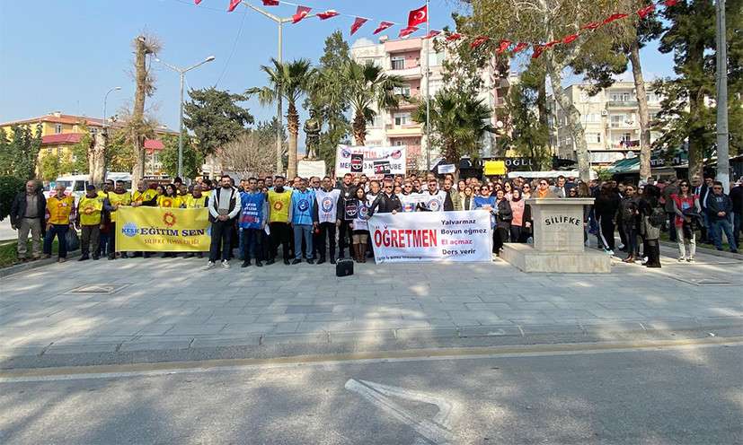 Ortak basın açıklamasına; Eğitim Birsen, Türk Eğitim Sen, Eğitim İş, Eğitim Sen ve Eğitim Gücü Sen’in Silifke temsilciliklerine bağlı yöneticiler ve üyeler katıldılar.