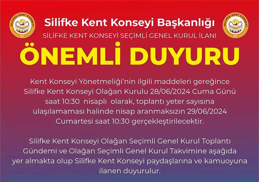 Yeni dönemde Silifke Kent Konseyini belirlemek ve Silifke için fikir üretecek insanları seçmek için STK ve Kaymakamlık tarafından belirlenen 22 muhtardan oluşan toplam 96 kişi Kent Konseyi Başkan ve Yürütme Kurulunu seçecek.