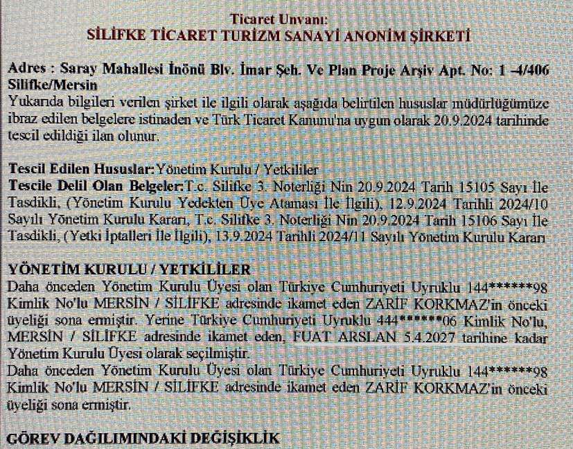 T.C. Ticaret Sicil Müdürlüğünün 20 Eylül tarih ve 11169 sayısında yer alan karar ile Zarif Korkmaz’ın üyeliğinin düştüğü ve yerine Fuat Arslan’ın atandığı bilgisi yer aldı.
