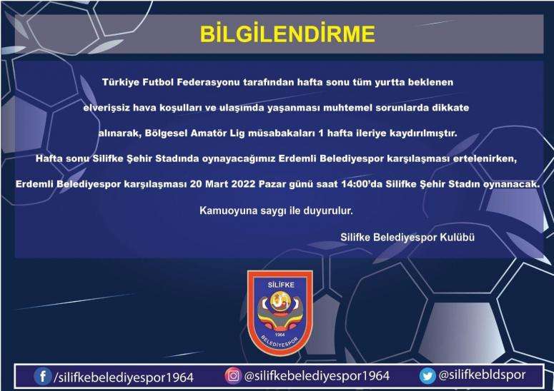 Silifke Belediyespor, sahasında karşılaşacağı Erdemli Belediyespor karşılaşması, kötü hava koşulları nedeni ile ertelendi. BAL dahil 2. ve 3. Lig karşılaşmaları da ertelendi.