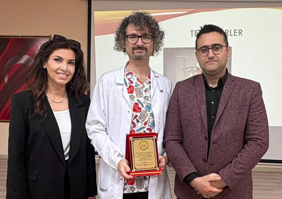 Okul idarecilerinin, öğretmenlerin öğrenci ve velilerin katıldığı söyleşinin sonunda, Okul Müdürü Doç. Okay Demir tarafından Dr. Örnek’e katkılarından dolayı plaket takdim edildi.