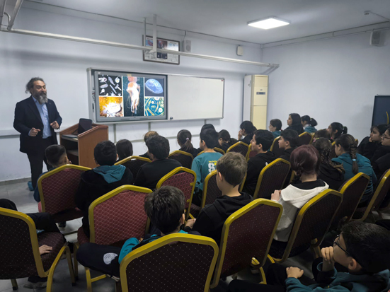 Bu kapsamda Prof. Dr. Deniz Ayas, öğrencilerle bir araya gelerek deniz altı ekosistemleri ve biyoçeşitlilik üzerine kapsamlı bir sunum gerçekleştirdi. Sunumda denizlerin ekolojik önemi, Akdeniz’e özgü canlı türleri, ekosistem dengesi ve insan faaliyetlerinin deniz yaşamı üzerindeki etkileri bilimsel bir bakış açısıyla ele alındı.