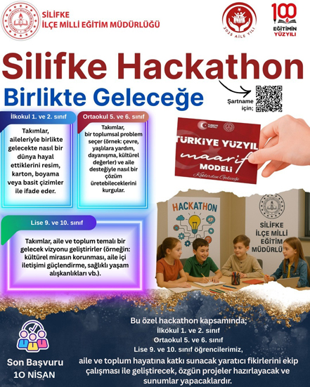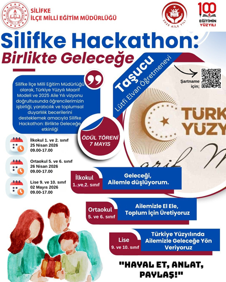 Silifke Milli Eğitim Müdürlüğü, eğitimde yeni vizyonun iki güçlü başlığını bir araya getiriyor: Türkiye Yüzyılı Maarif Modeli ve 2025 Aile Yılı. “Birlikte Geleceğe” Hackathonu Başlıyor! Başlığı ile öğrenci velilerini de içine alan takım yarışmaları başlayacak.