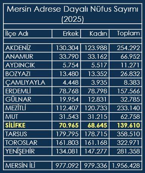 Silifke’nin nüfusu ise 242 kişi azalarak, 139.610 oldu. İlçe nüfusunun 70.965 kişisini erkekler oluştururken 68.645 kişisi kadınlardan oluştu.