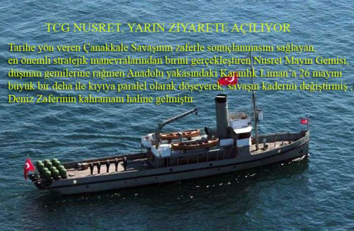 EDİTÖR NOTU: Savaşın kaderini değiştiren dünyanın en ünlü mayın gemisi ünvanina sahip Nusret Mayın Gemisi yarın Silifke;Taşucu Suhil Güvenlik rıhtımında sizleri bekliyor olacak. Tarih yazan Nusret Mayın Gemisinin birebir aynısı olan ve müze olarak hizmet veren Nusret Mayın Gemisini mutlaka ziyaret ediniz. yarından sonra ziyaret etmek isterseniz Çanakkele'ye gitmeniz gerekecek.