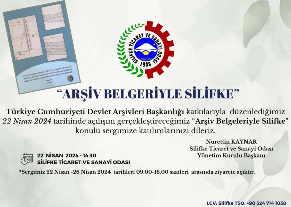 Sergi ile ilgili olarak gazetemize açıklama yapan TSO Başkanı Nurettin Kaynar, “Türkiye Cumhuriyeti Devlet Arşivleri Başkanlığının katkıları ile açılışını gerçekleştireceğimiz “Arşiv Belgeleri ile Silifke” konulu resim sergisi ile ilgili belge ve resimler, Devlet Arşivleri Başkanlığından temin edildi. Silifke'ye ait, Türkçeye çevirisi olan Osmanlıca alfabesi ile yazılan arşiv belgeleri Silifke Ticaret ve Sanayi Odamızda 22-26 Nisan 2024 tarihlerinde mesai saatleri içerisinde sergilenecektir.